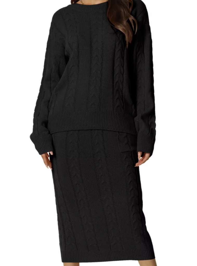We love a sweater set, and this sweater paired with the knit midi is perfect for the holidays.